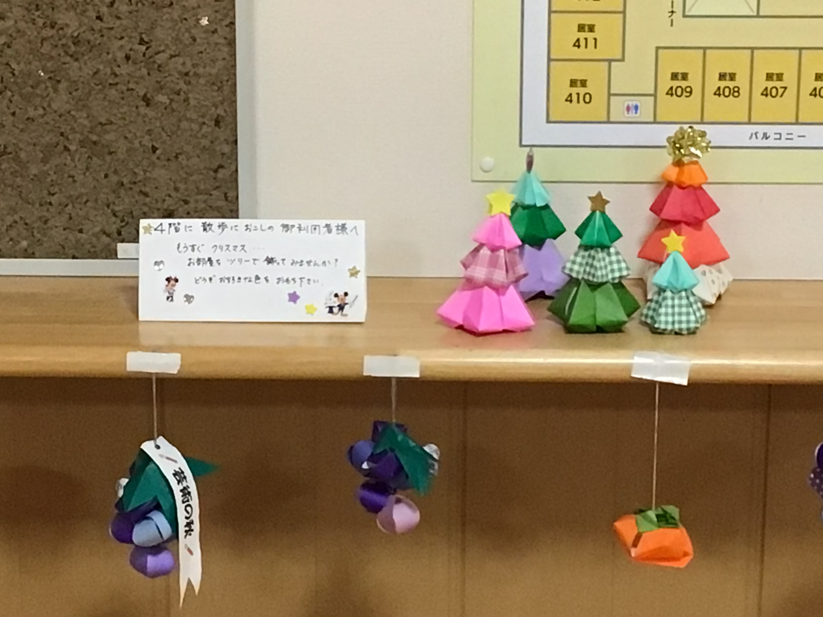 4階では職員の手作りでツリーの飾りを作ってくれました。お散歩で通った際に持ち帰って頂けるよう置いています。